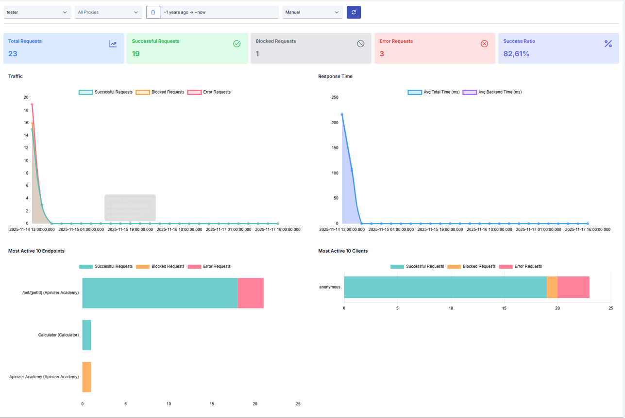 The API Analytics tab provides summary information on API Proxy performance, endpoint usage statistics, and client activity.