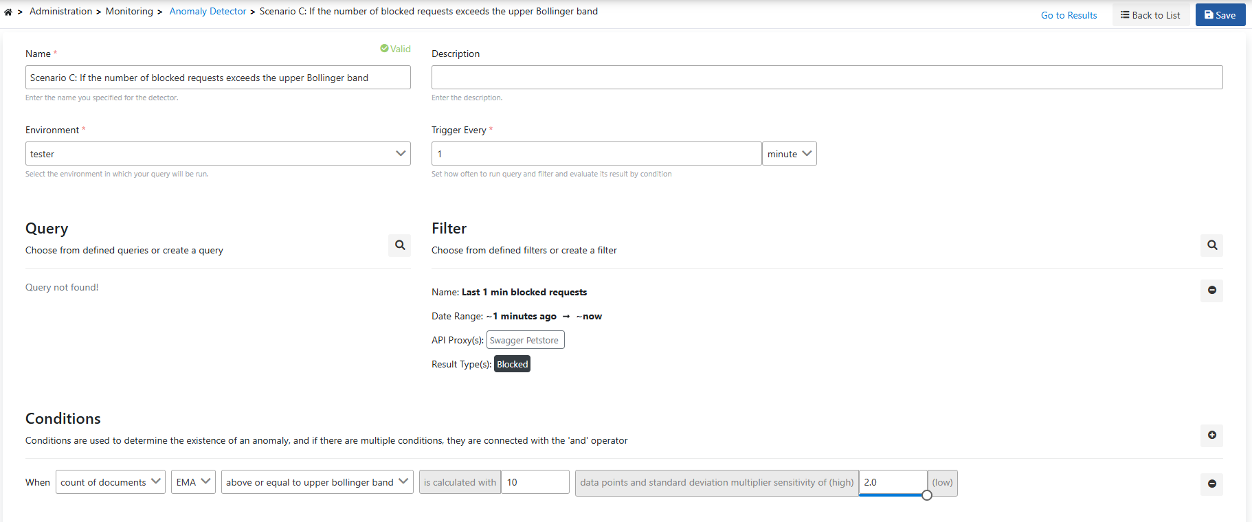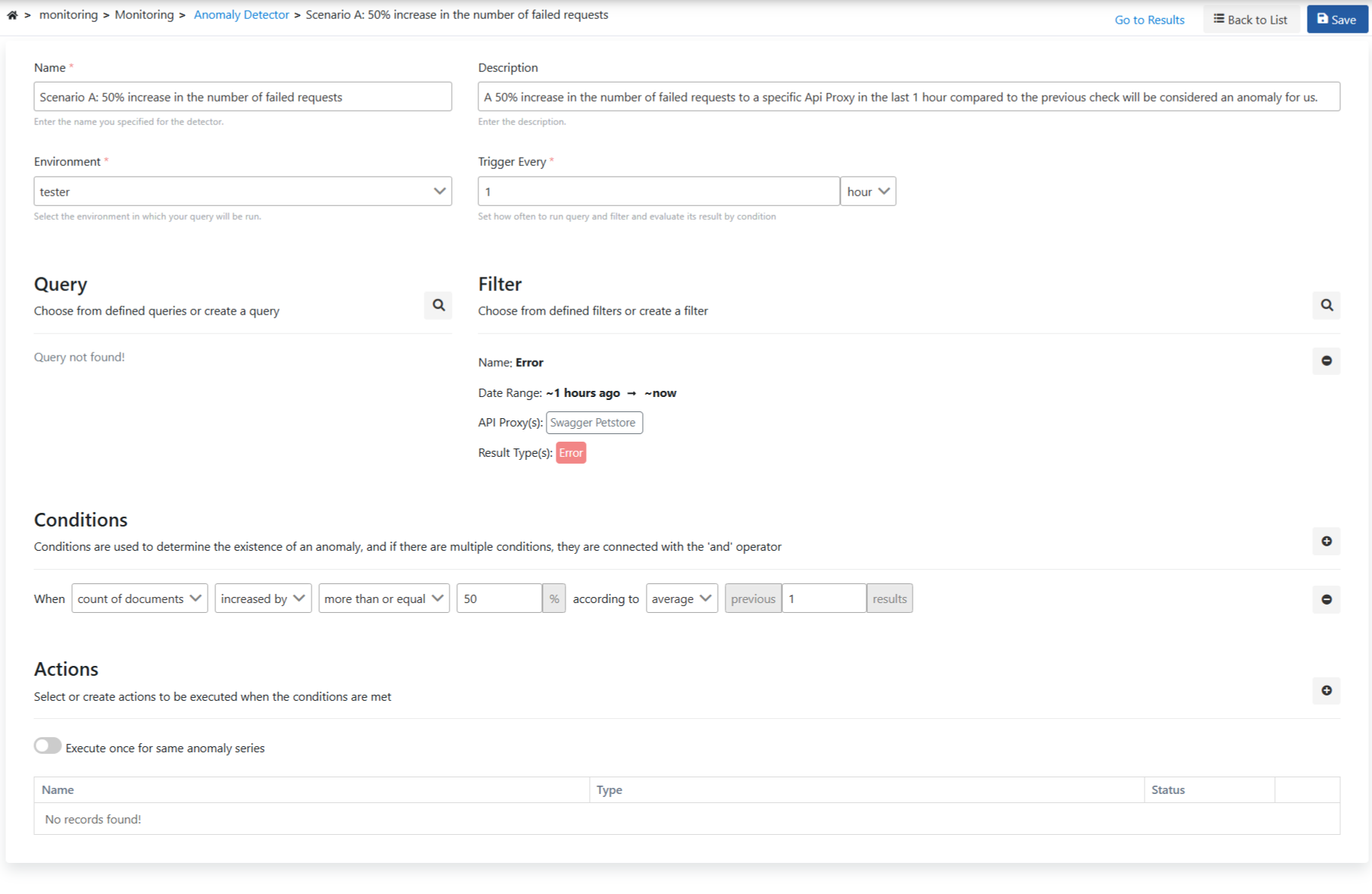 Scenario A: A 50% increase in the number of failed requests to a specific Api Proxy in the last 1 hour compared to the previous control will be considered an anomaly for us.
