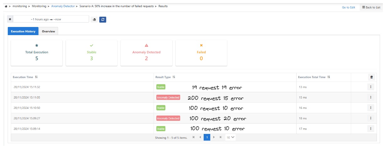 In this scenario, only failed requests are filtered and failed requests in the last 1 hour are analyzed. If the proportion of total failed requests in the previous hour is 50% or more, this is considered an anomaly.