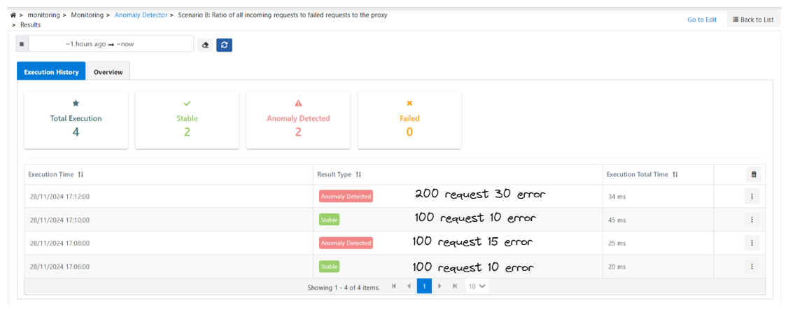 Scenario C: A continuous 50% increase in the number of failed requests to a specific Api Proxy in the last 1 hour compared to the previous check, but this will be considered normal for various reasons, if it exceeds this increase, this will be considered an anomaly for us. There will be an anomaly check that will track the increase and normalize it, and report the checks that do not match this increase.