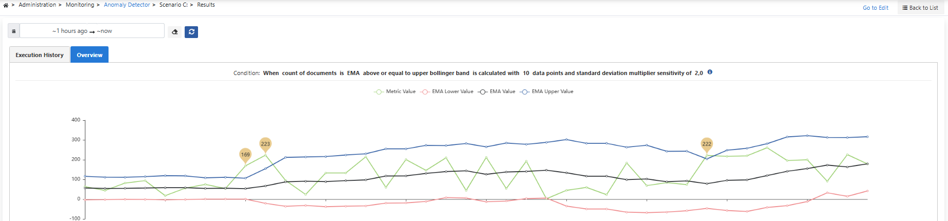 The number of blocked requests in the last 1 minute is compared to the EMA value calculated based on the last 10 data points and if it is equal to or higher than the upper Bollinger band, this is detected as an anomaly, the standard deviation multiplier sensitivity is set to 2.0.