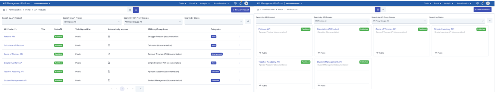 API Products List | Access: Manager → Administration → Portal → API Products View Options: 1. Grid View (Card View)