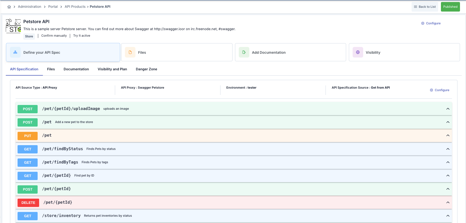 Step 1: Accessing the API Specification Tab | API Product detail page → API Specification If not yet configured: “Define your API Spec” card If configured: API information and operations list |