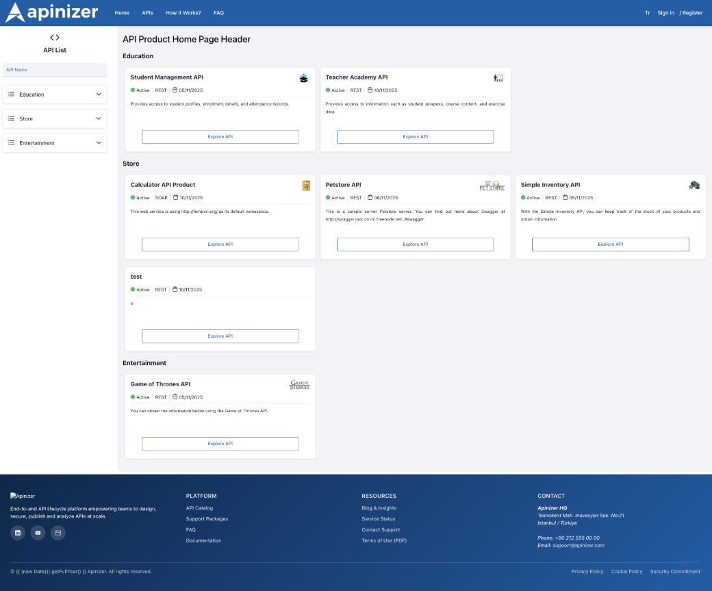 - The “Explore API” button directs you to the product details page.