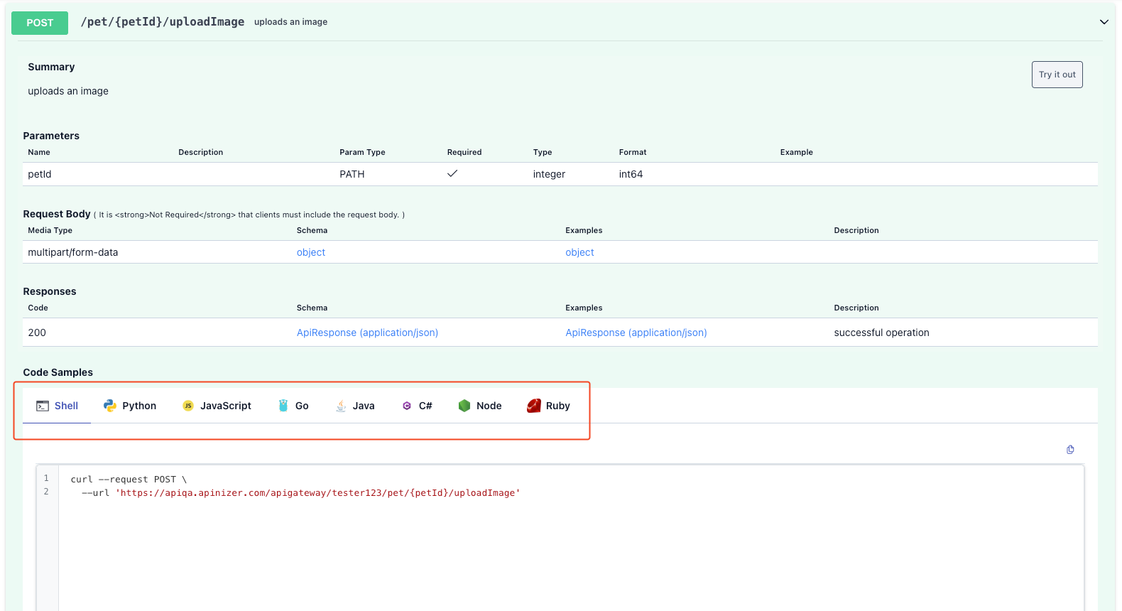 Code Examples in the API Specification Tab