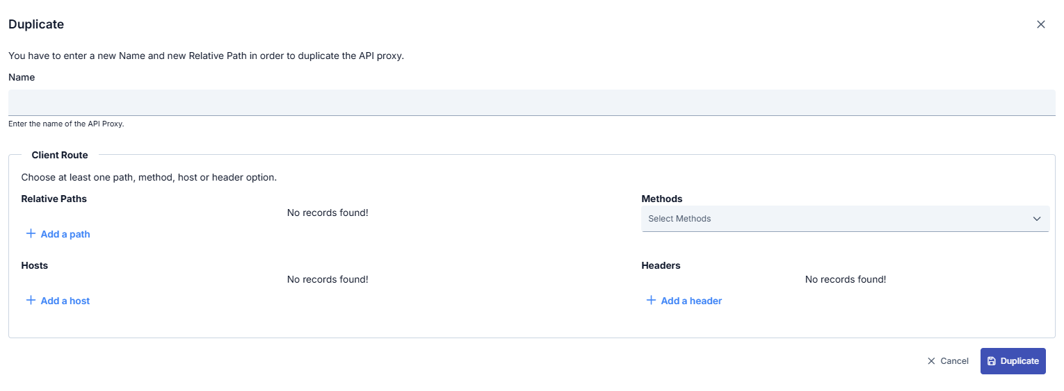 For the new API Proxy to be created by duplication, the user is prompted to enter a new name and a new gateway address.