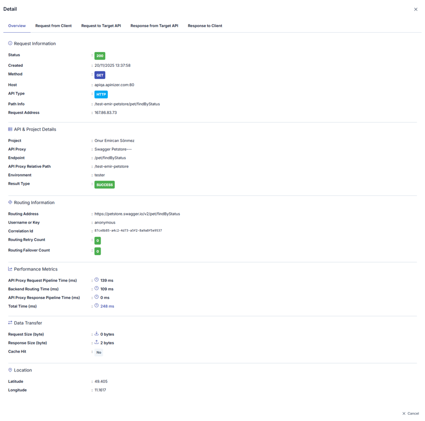 Açılan pencerede, logların mesaj akışına ilişkin bölümlere ayrıldığı görülür. İncelenmek istenen bölümün (örneğin İstemciden API Proxy'e Gelen İstek (Request From Client) bölümünün) adına tıklandığında bu alana ilişkin log kayıtları görüntülenir. Varsayılan olarak Genel Bakış (Overview) bölümü açıktır.