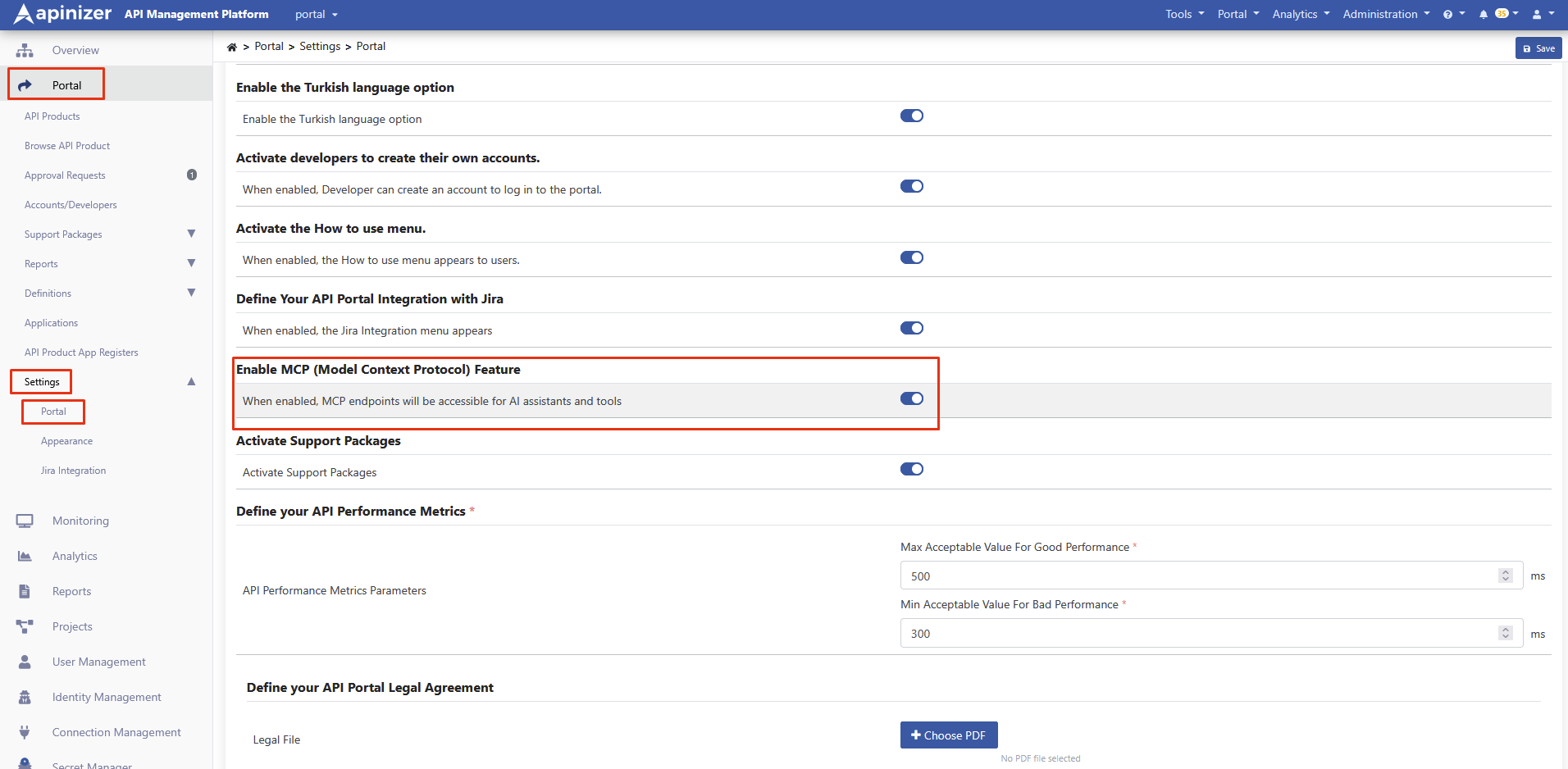 Apinizer araüyüzünde Portal ayarları sayfasına geçilir ve MCP aktifleştirilir.