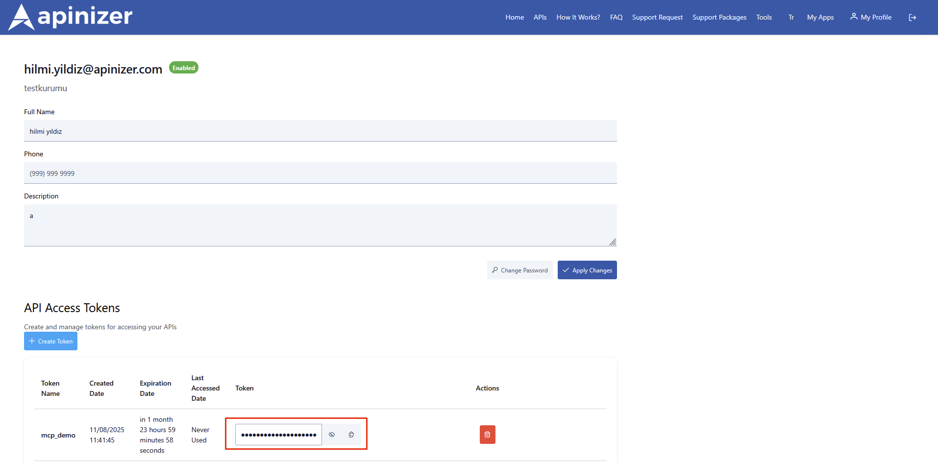 -Apinizer API portaline mcp_xxx tokenı ile bağlanabilir misin?