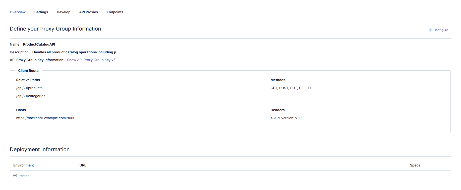 | Deployment Information | API Proxy Group'un deployment durumu ve ortam bilgileri. Environment: API Proxy Group'un deploy edildiği ortam (Development, Test, Production). URL: API Proxy Group'a erişim için kullanılacak tam URL adresi. Specs: API Proxy Group'un OpenAPI/Swagger spesifikasyon bilgileri. |