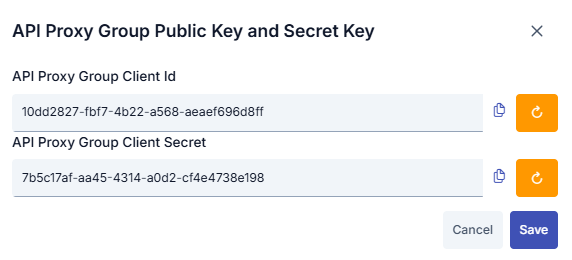 Client Id ve Client Secret değerleri otomatik olarak oluşturulur ve kullanıcı yenilerinin oluşturulmasını isteyebilir. Yüklenmiş bir API Proxy Grup için anahtarlardan herhangi birisi yeniden oluşturulursa, anahtarların geçerli olabilmesi için API Proxy Grubun yeniden yüklenmesi gerekir.