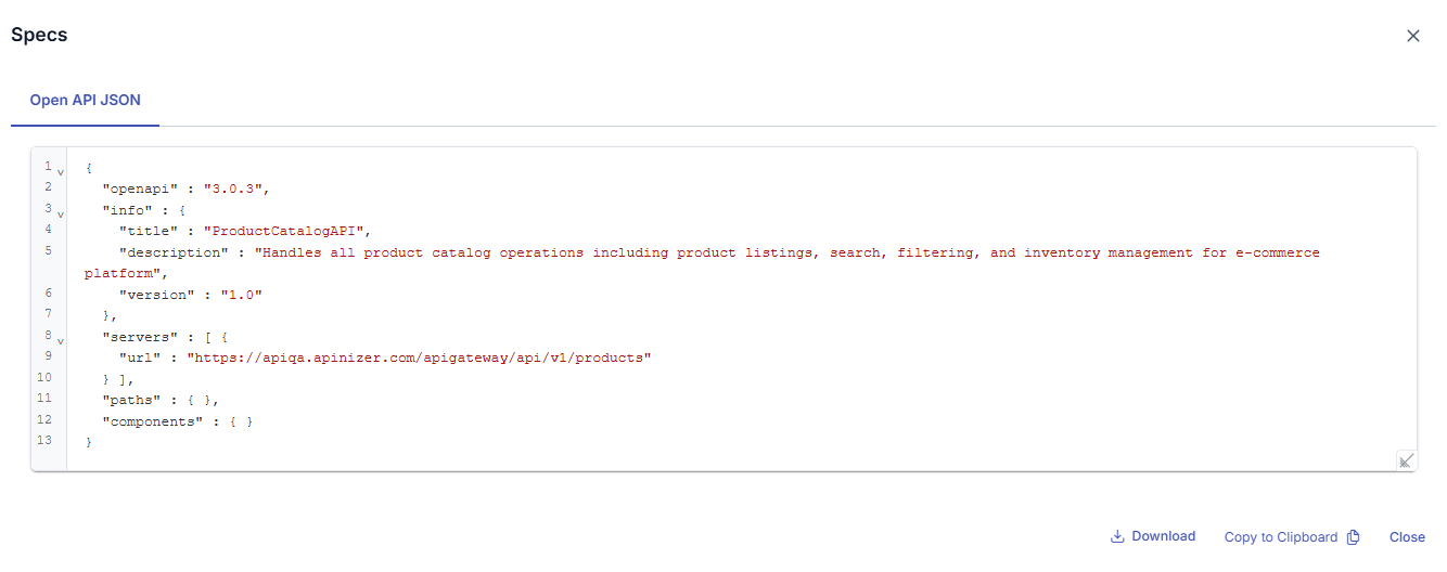 Tanım dosyalarının içeriği, Show bağlantısına tıklandığında yukarıdaki şekilde görüldüğü gibi açılır ve buradan kopyalanabilir. Ancak bu yöntem Apinizer platformu üzerinde çalışmakta olan API Geliştirici, API Testçi gibi rollerden kullanıcılar içindir. İstemciler bu arayüzlere erişemez.
