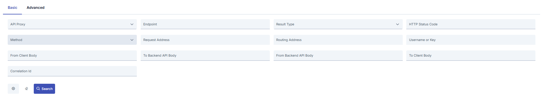 Basit (Basic) sekmesinde, kayıtlara, belirli bir zaman aralığı, uç nokta (endpoint) ya da HTTP metodu gibi belirlenmiş kriterler ile filtre uygulanması sağlanır.