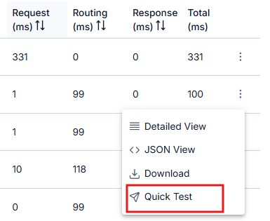 İlgili satırdaki Hızlı Test (Quick Test) tuşu, gönderilen isteğin yeniden gönderilerek anında test edilebileceği şekilde biçimlendirilmiş olarak Test Konsolunu açar.