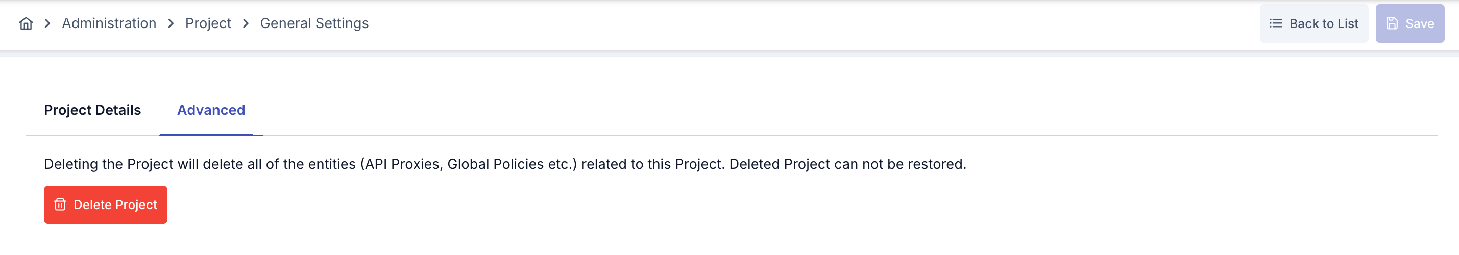 Bir projeyi sildiğiniz zaman o projeye ait olan tüm varlıklar (API Proxy'ler, Bağlantı Konfigürasyonları, Kimlik Bilgileri bilgileri vs) ve konfigürasyon bilgileri silinecektir.
