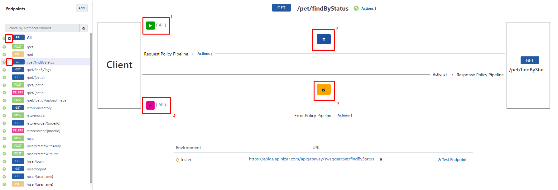 - 2 numaralı çerçeve ile işaretlenen alanda, seçilmiş olan metot/endpoint için geçerli olacak şekilde ve istek mesajlarına uygulanacak olan politikalar görülür.
