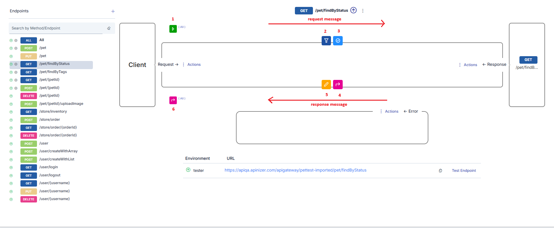 - 3 numaralı çerçeve ile işaretlenen alanda, seçilmiş olan metot/endpoint için geçerli olacak şekilde ve yanıt mesajlarına uygulanacak olan politikalar görülür.