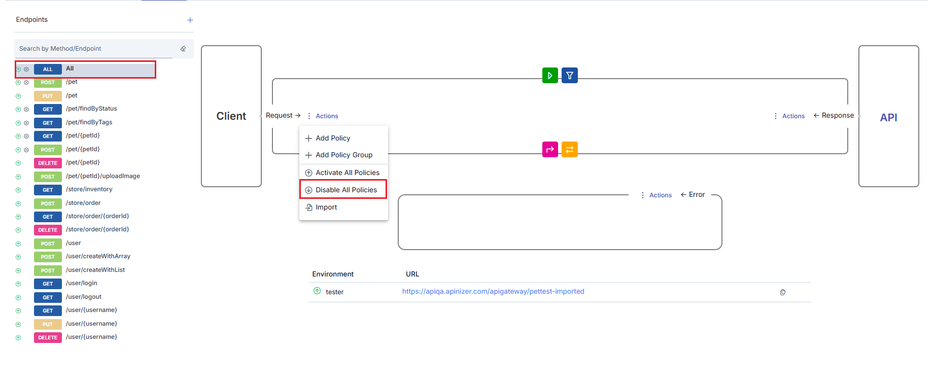 Metot/endpoint bölümünde, orta bölümün alt kısmında Bütün Politikaları Kapat (Disable All Policies) bağlantısı belirir. Bu bağlantıya tıklandığı zaman, eğer Hepsi (All) seçeneğinde ise API Proxy üzerine eklenmiş olan bütün politikalar; eğer herhangi bir metot içerisindeyse sadece o metot içerisinde eklenmiş olan tüm politikalar devre dışı kalır. Kullanımdan kaldırılmış olan politikalar daha sonra politika güncelleme penceresinden tek tek ya da Bütün Politikaları Aç (Activate All Policies) bağlantısına tıklanarak toplu olarak yeniden etkinleştirilebilir.