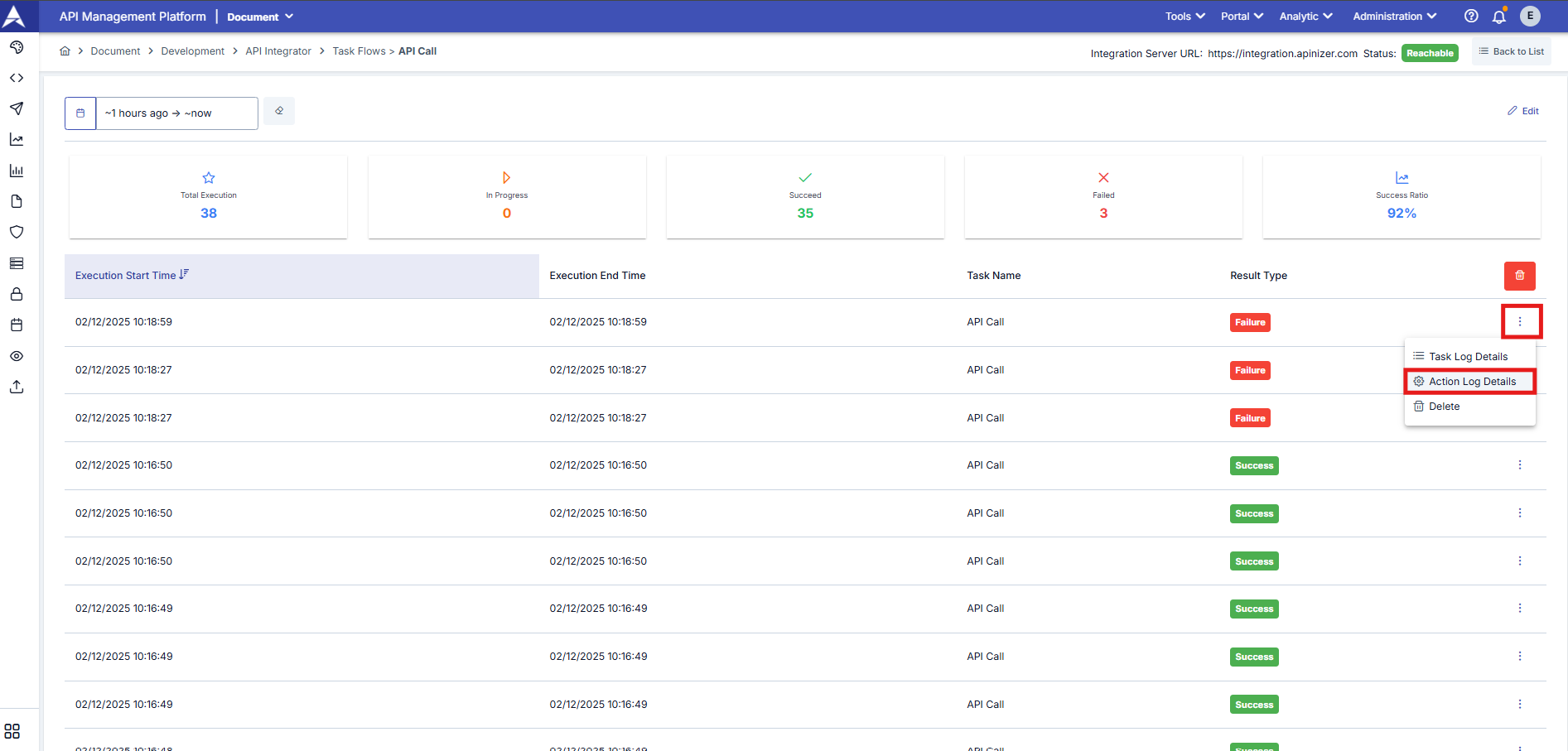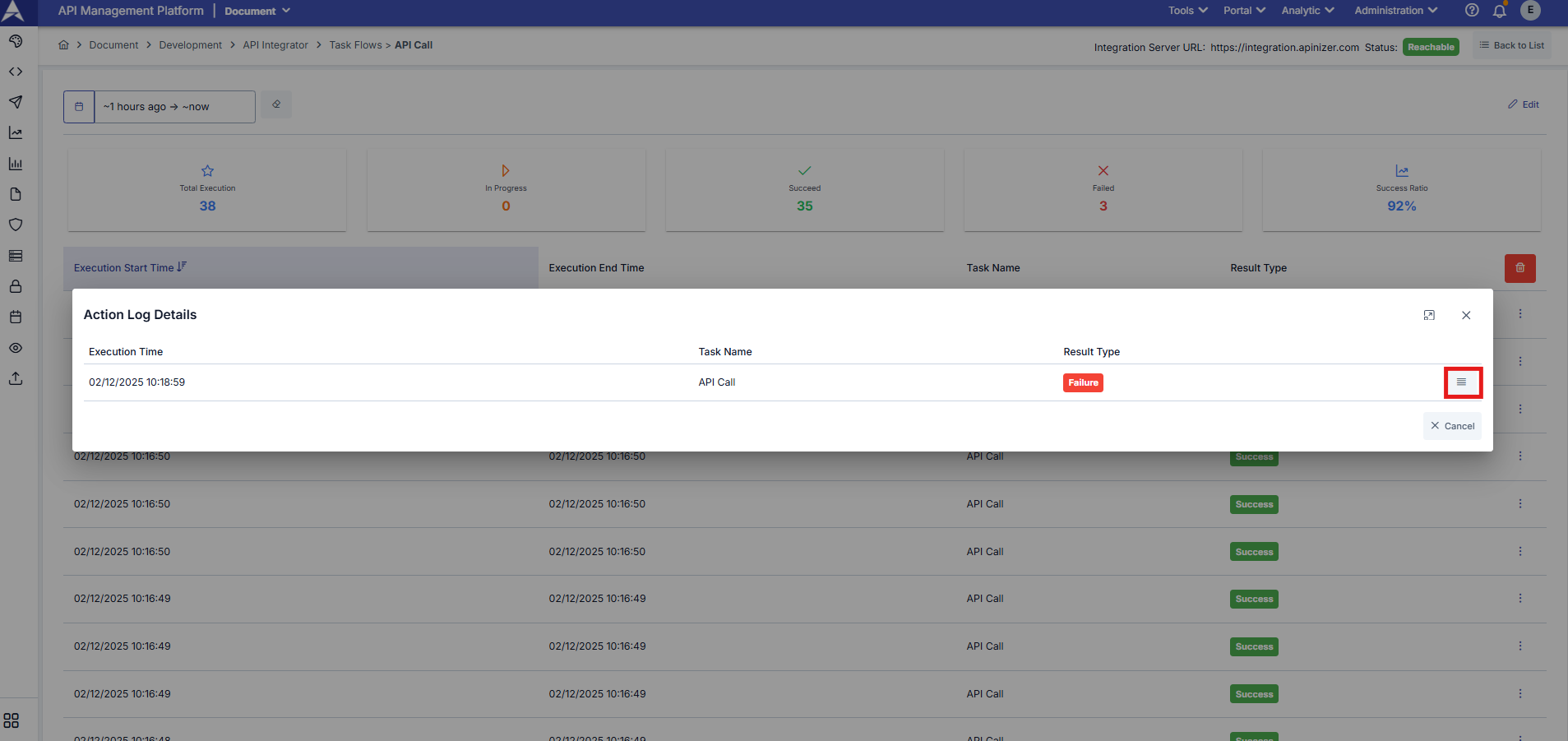Akışta başarısızlıkla sonuçlanırsa eğer tanımlanmış eylem varsa detayları loglanır. Eylemlerin çalışma geçmişini gösteren dialogun görseli aşağıdadır.