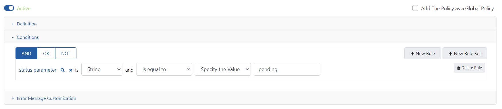 Aşağıdaki görselde, seçilmiş olan politikanın yalnızca "status" parametresinin değeri "pending" ise çalışması istendiği bir örnek koşul görülmektedir