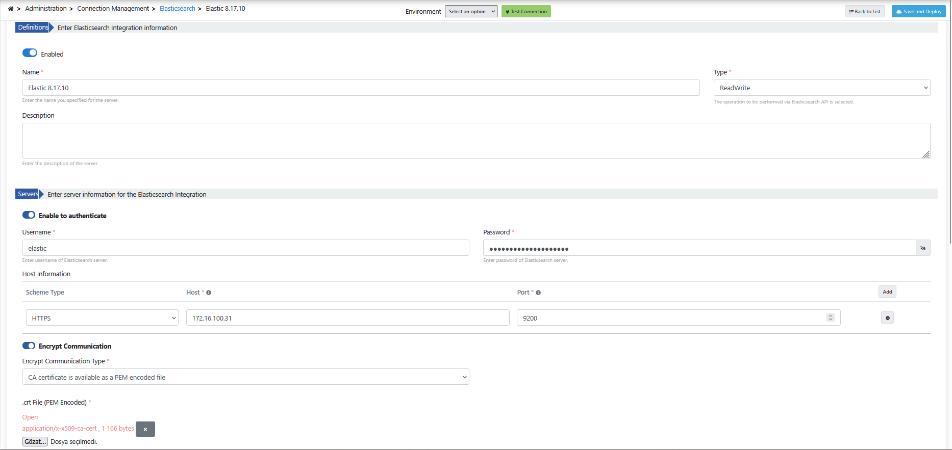 Administration > Connection Management > Elasticsearch Sayfasına gidilir ve sunucuda oluşturulan isim-şifre ve elastic-certificates.crt isimli sertifika; sunucu bilgileri ile birlikte arayüz üzerinden eklenir.