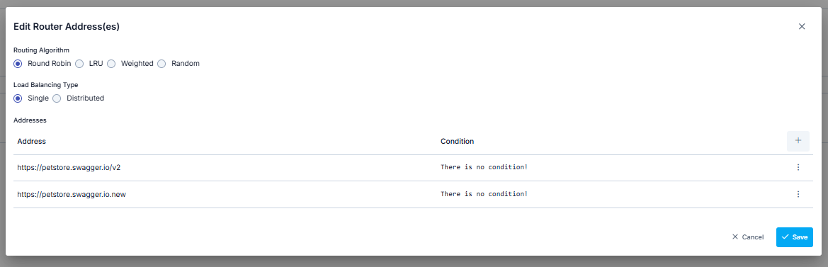Adres güncelleme ya da ekleme işlemleri için açılan penceredeki Koşul (Condition) bölümü, istemciden gelen mesajların bu adrese gönderilmesi için koşul tanımlama olanağı verir. Böylece örneğin özel bir başlık ya da parametre değeri ile gelmeyen isteklerin tanımlı adreslerden sadece belirli bir ya da daha fazlasına yönlendirilmesi sağlanabilir.