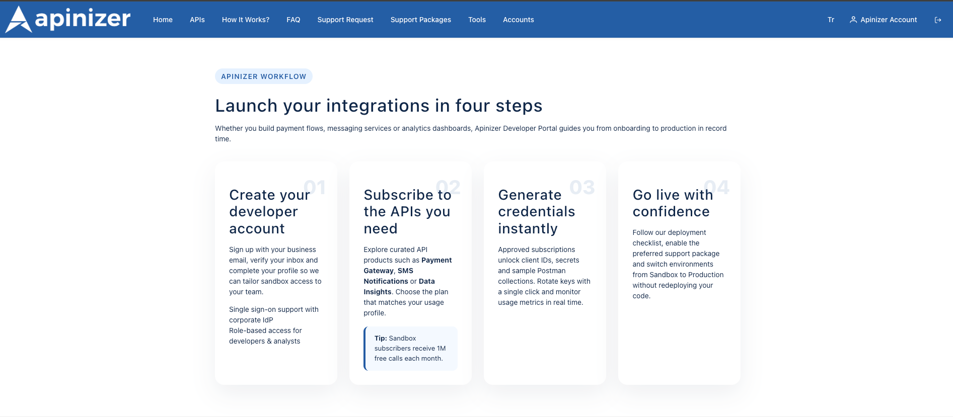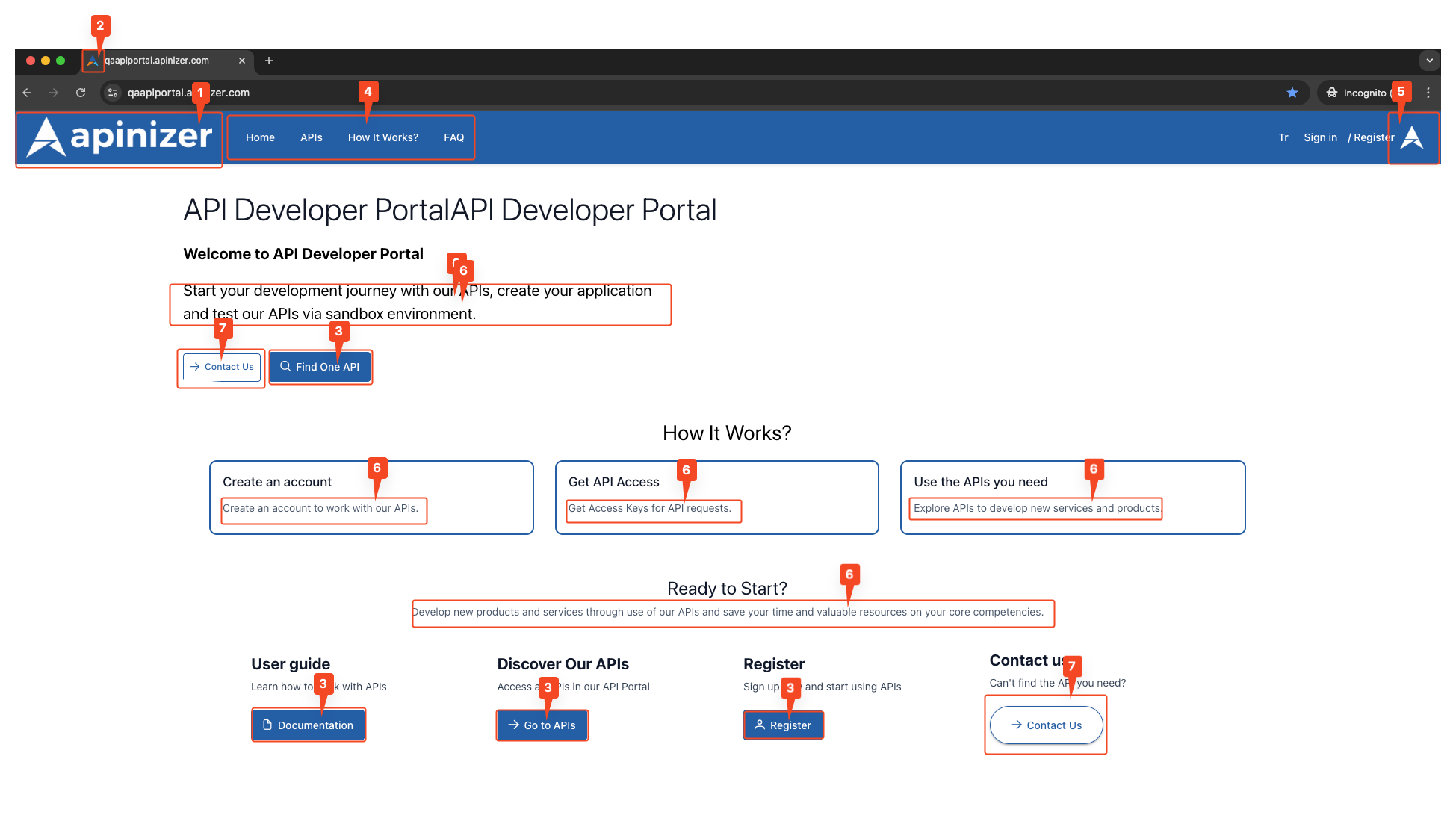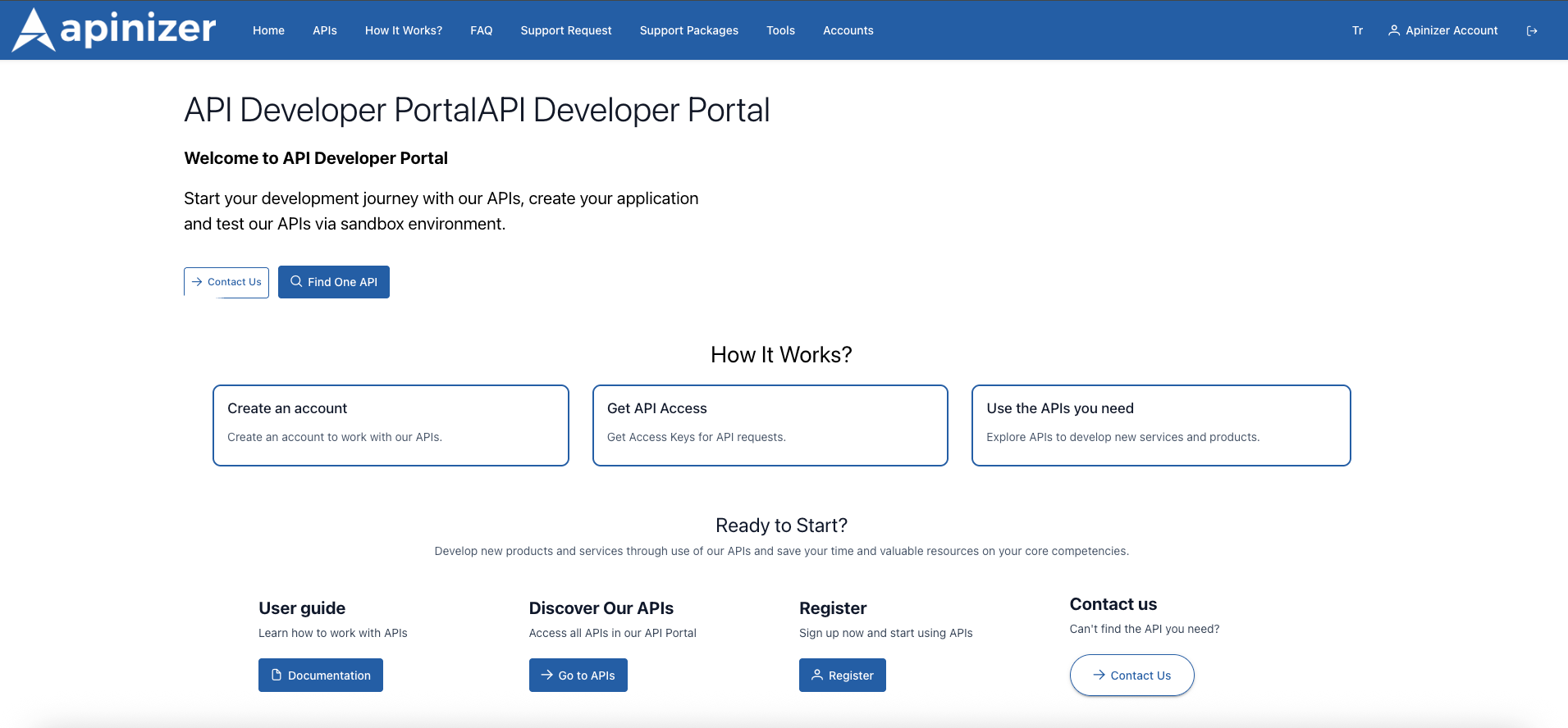 When default content is entered, the portal homepage opens with a welcome header, a short description, and action cards such as “How It Works?”, “Discover Our APIs”, ‘Register’, and “Contact Us”. The attached screenshot (example) shows how the homepage cards are aligned.