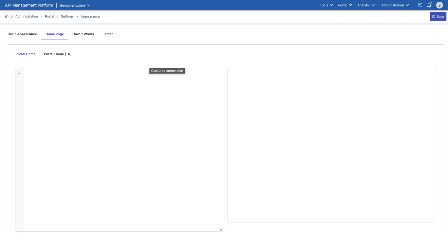 This area is the section where the content users first encounter on the API Portal homepage is organized. The portal's introductory texts, explanatory descriptions, links, or visual content are defined in this tab.