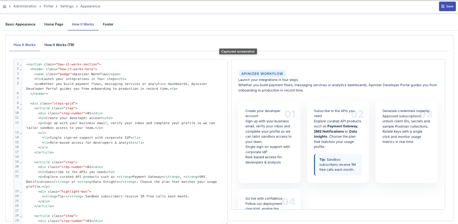 This area is used to manage the content of the “How It Works” page on the API Portal. It is the section where portal users are provided with informative content such as the general operation of the system, the API access process, or a step-by-step usage guide.