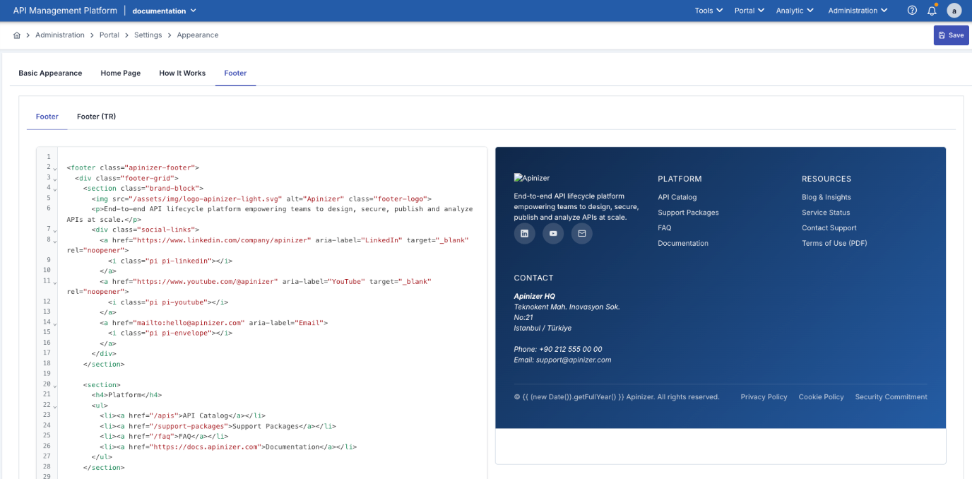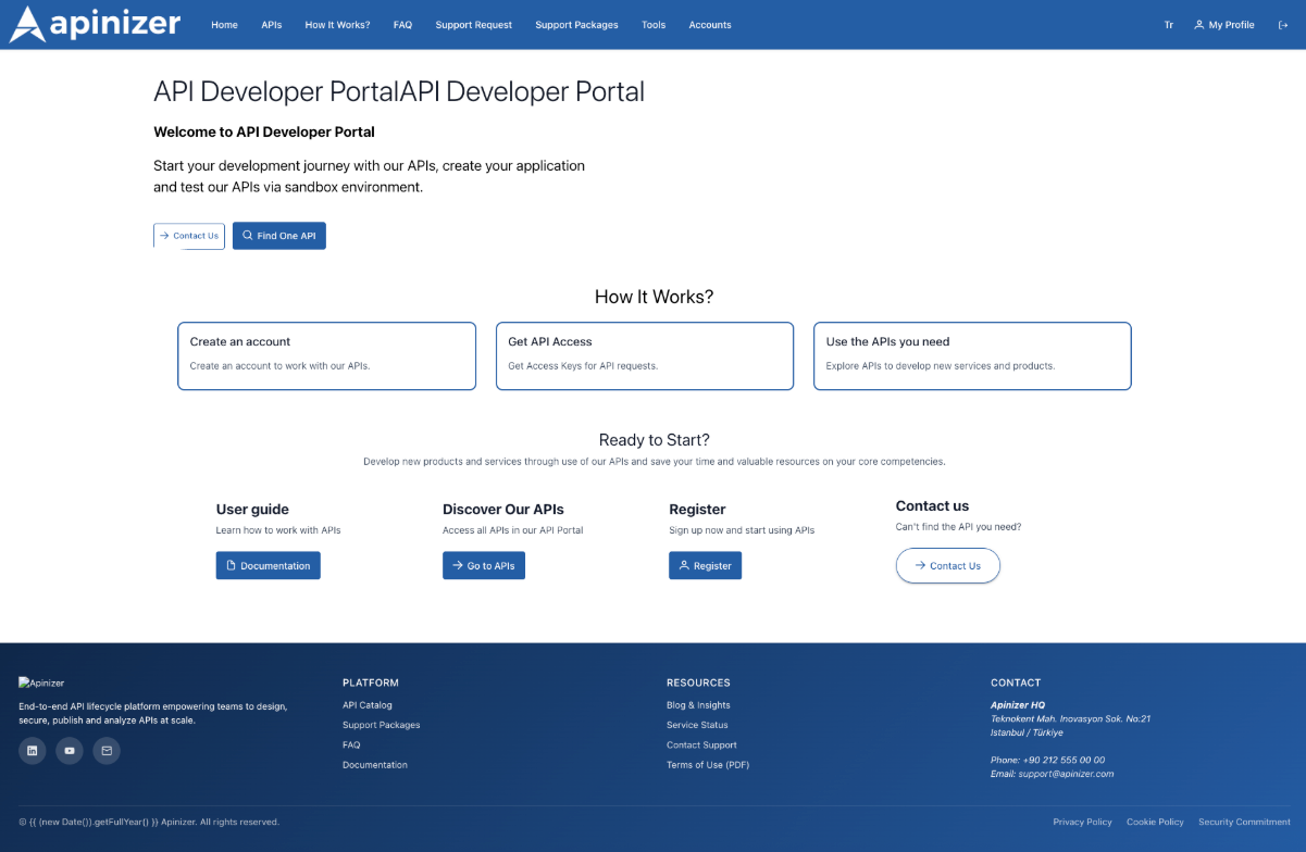 This page allows you to customize the Apinizer API Portal interface to match your corporate identity. The portal's overall design, color scheme, font, page headers, and content areas are managed through this screen. It also allows for the creation of multilingual content for the home page, information (“How It Works”) and footer areas. Changes made can be previewed in real time on the portal interface and are implemented to provide the user with a corporate, holistic experience.