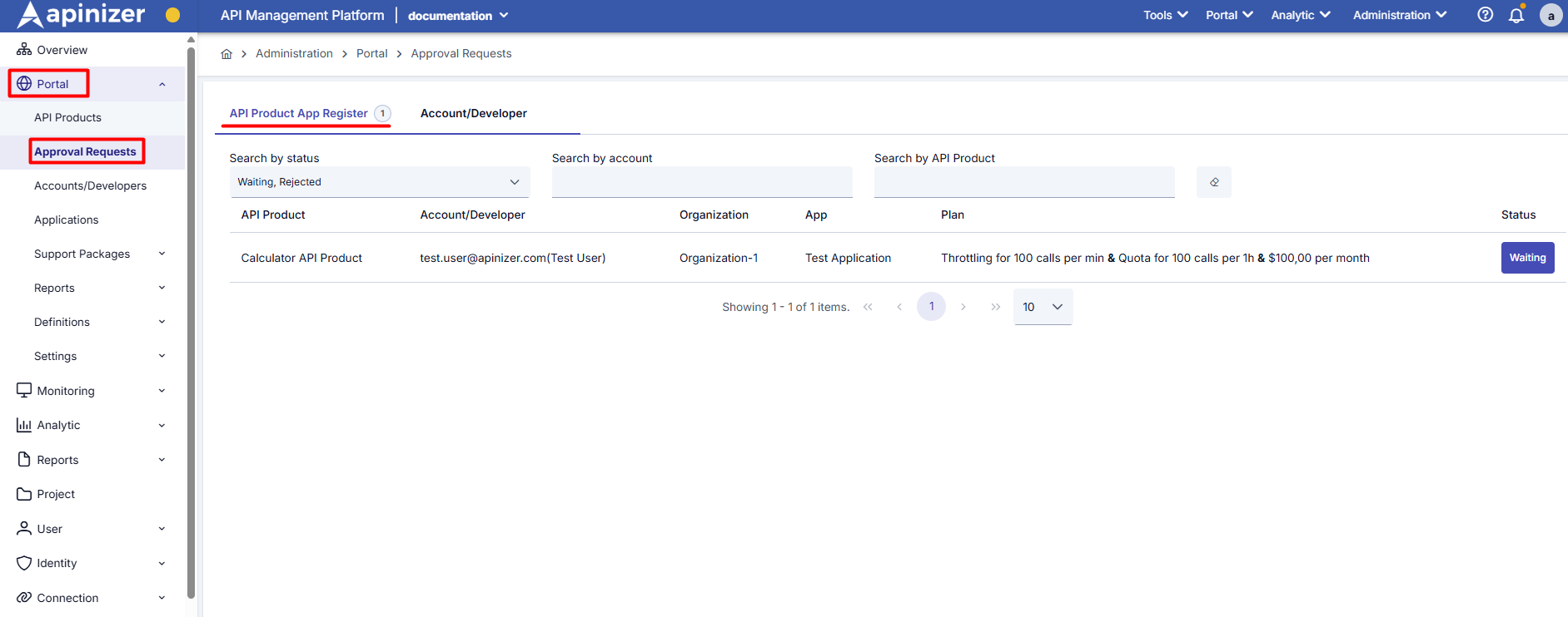 When a user creates an access request, this request is forwarded to the Apinizer API Manager > Administration > Portal > Approval Requests page on the Apinizer interface. On this page, product owners can view and review the access requests they receive and approve or reject them as they see fit. This page is described in detail below.