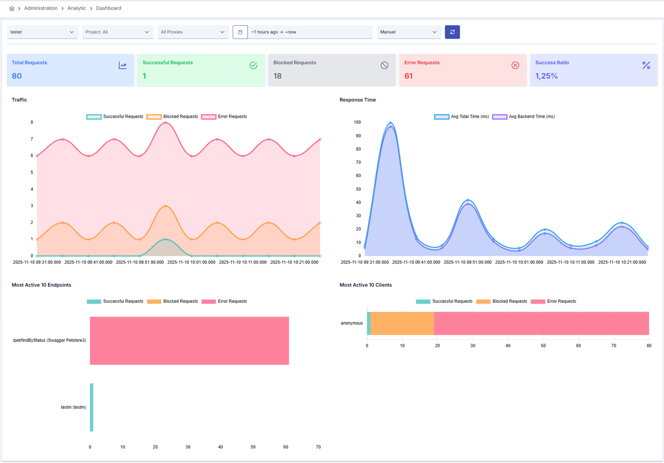 The Analytics Dashboard is created from the log data of the API Proxies included in the project. Dashboard allows to monitor the general status of API Proxies.