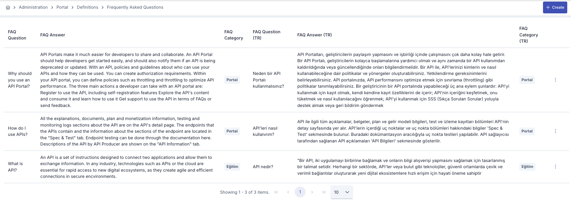 The API Developer Portal manages frequently asked questions and answers from users. Administrator users enhance the portal's user experience by defining question-and-answer content in both English and Turkish. This allows API consumers to quickly access frequently asked information through the portal.