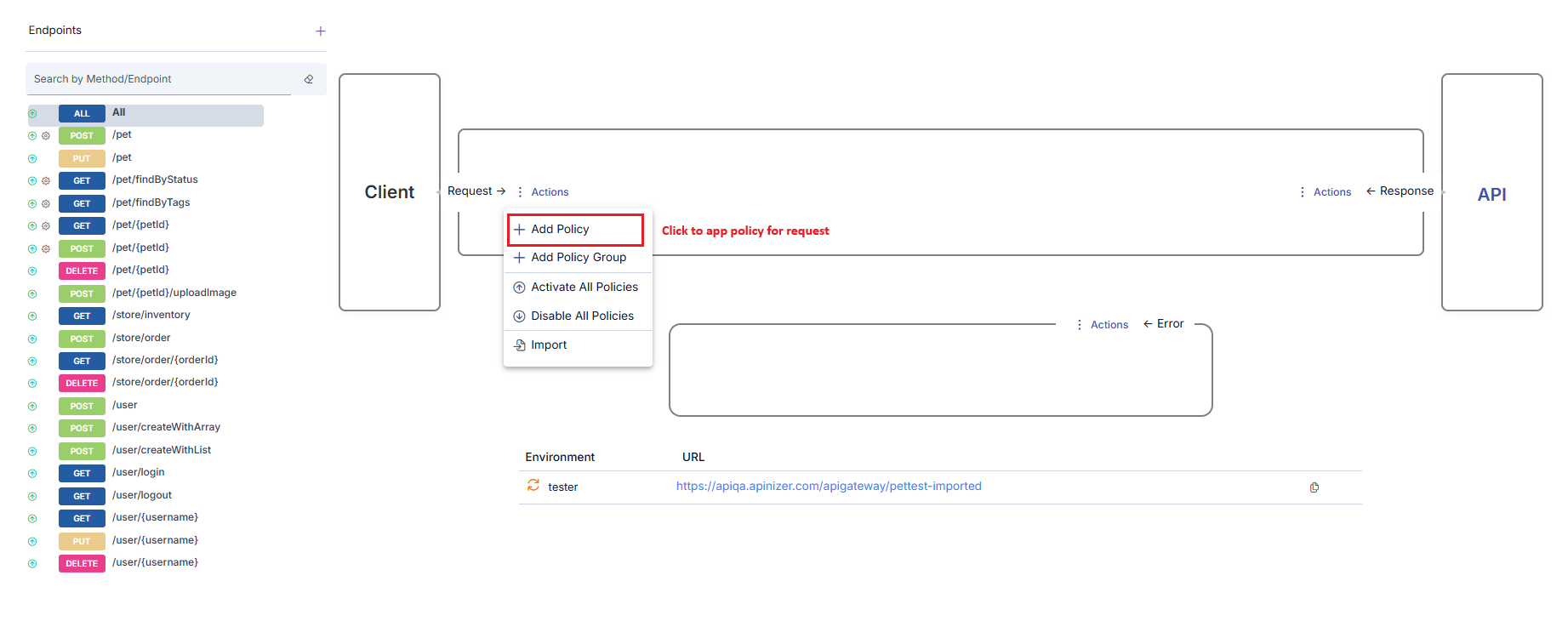 The image below shows an example of policies added to all 3 points. In the image, it can be seen that the API Proxy with the selected method/endpoint named GET - findByStatus has been added to an API Proxy Group named Proxy Group - 1. The marked areas are where policies are displayed depending on where they are added.