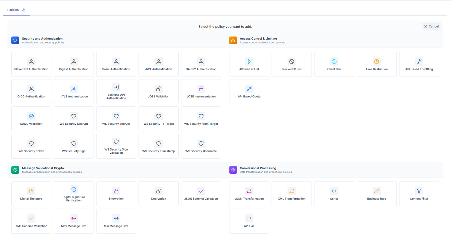 From the opened window, the type of policy to be added is selected. The policy types shown in this window vary according to the type of the active API Proxy and which region the policy is desired to be added to.