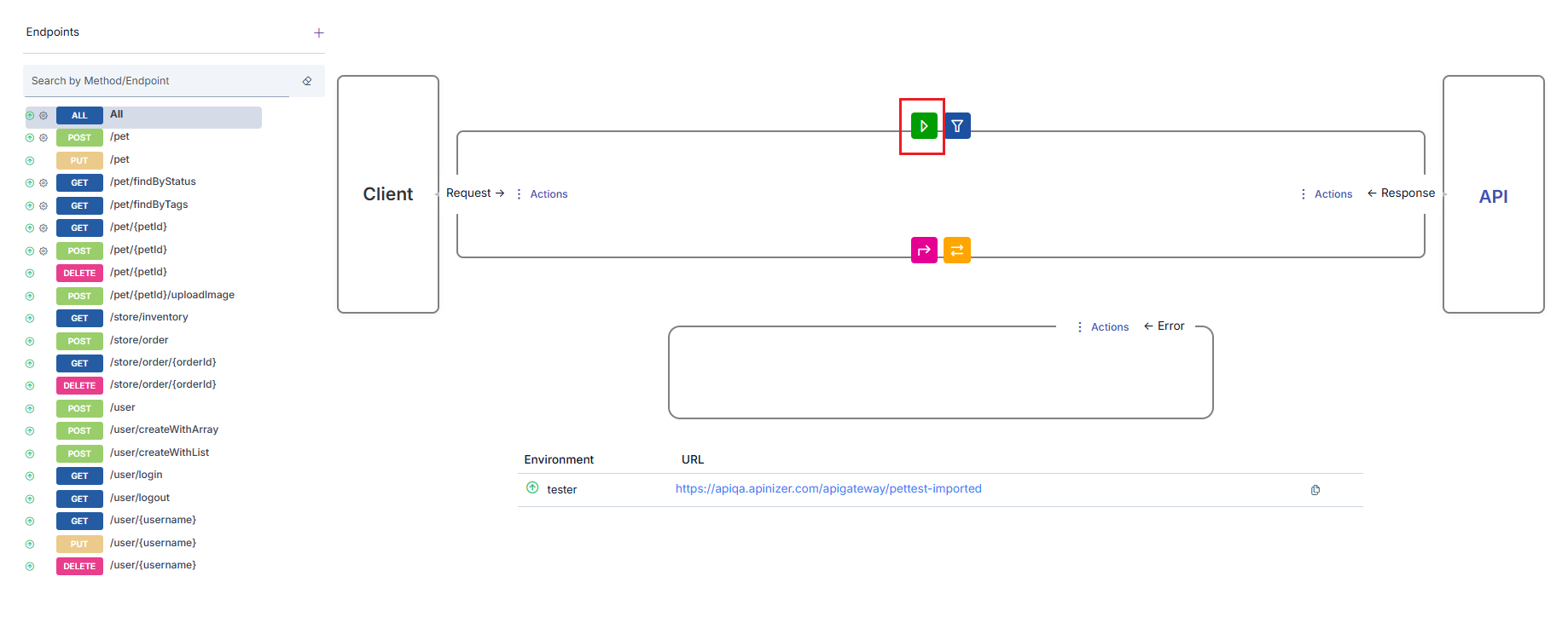 Displayed in the frame on the left side of the interface. It is the stakeholder that sends requests to the API Proxy. It initiates the flow. The message leaving the Client reaches the Backend API after policies are applied.