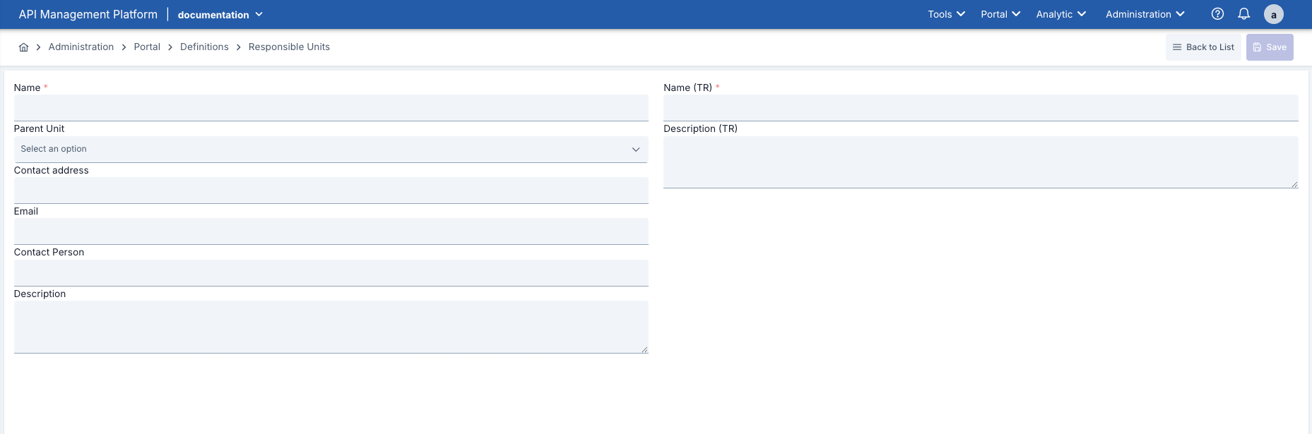 The API Product Responsible Units screen is an enterprise management tool that allows you to define the team or individuals responsible for managing your API products and associate these responsible parties with API products. You can centrally record the operations, support, development, or business unit responsible parties for each API product, send notifications to these teams when necessary, and make them visible in reports.