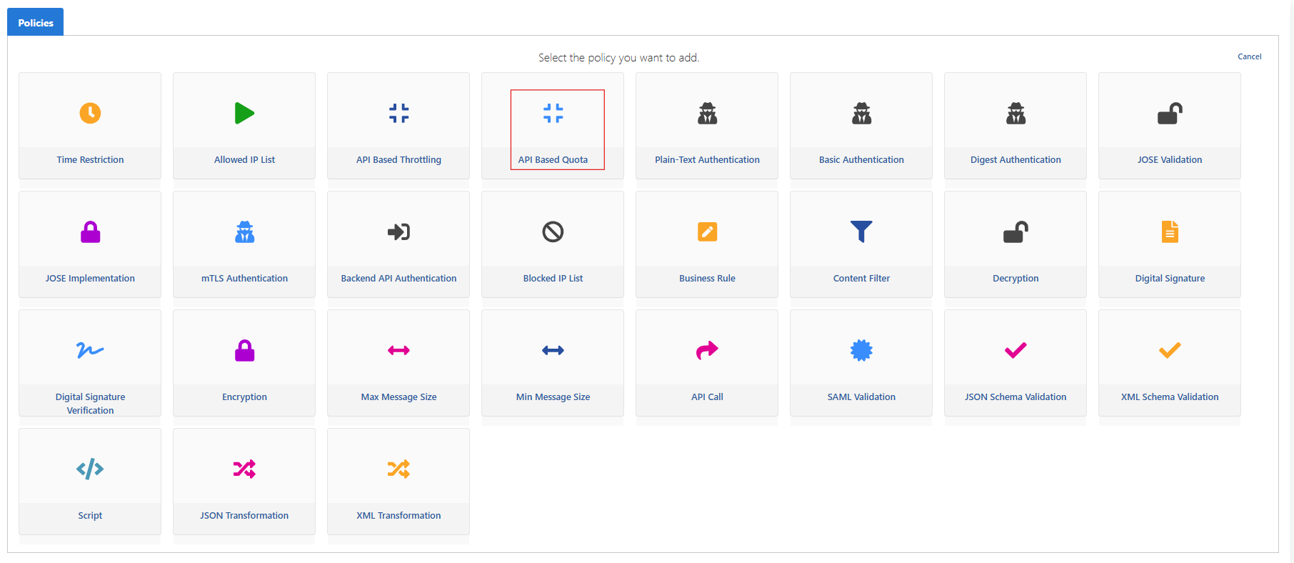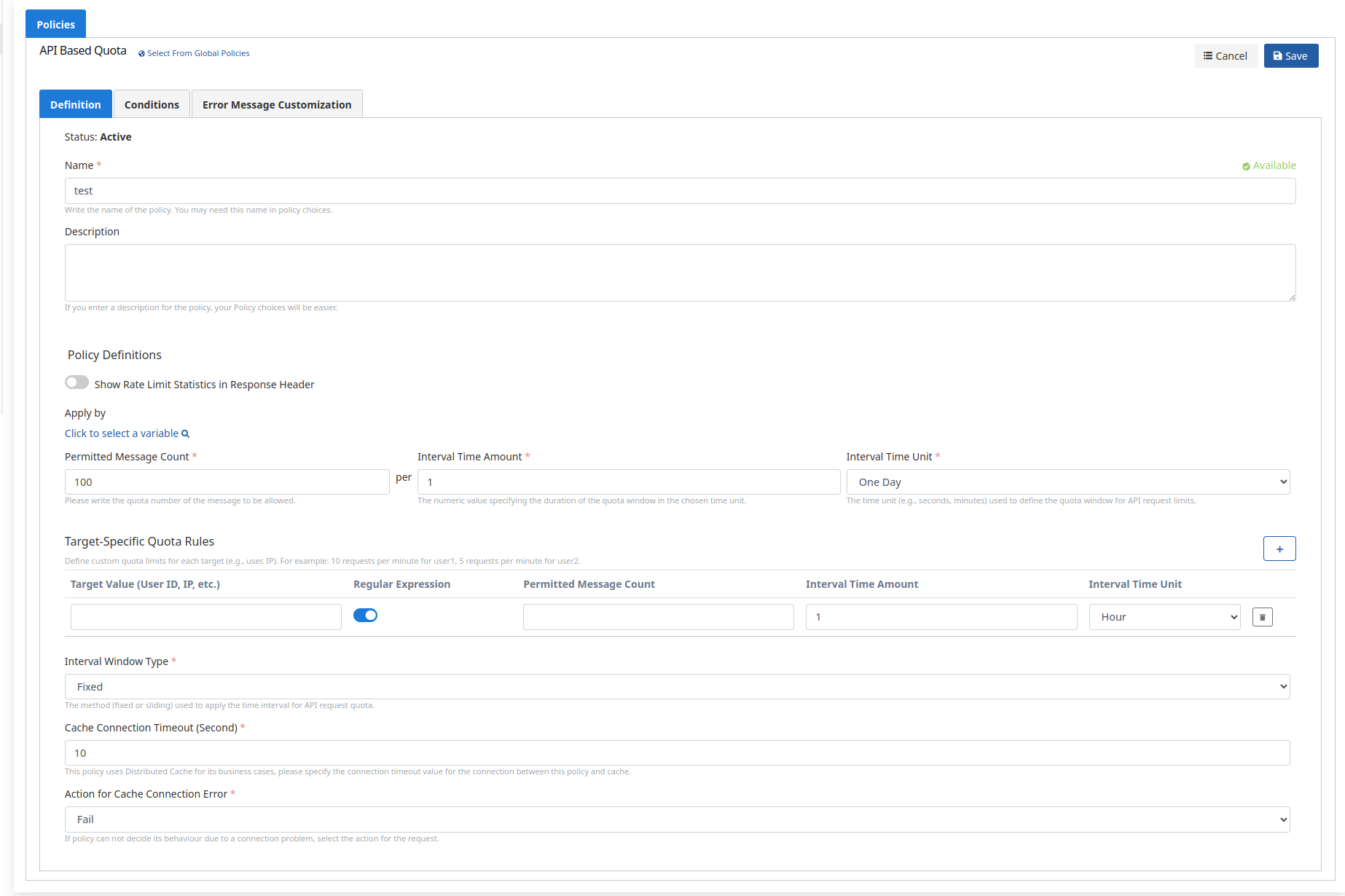 Bu özellik sayesinde belirli kullanıcılar veya hedefler için özel kota sınırlamaları tanımlayabilirsiniz. Politika olarak API Based Quota ekliyoruz.