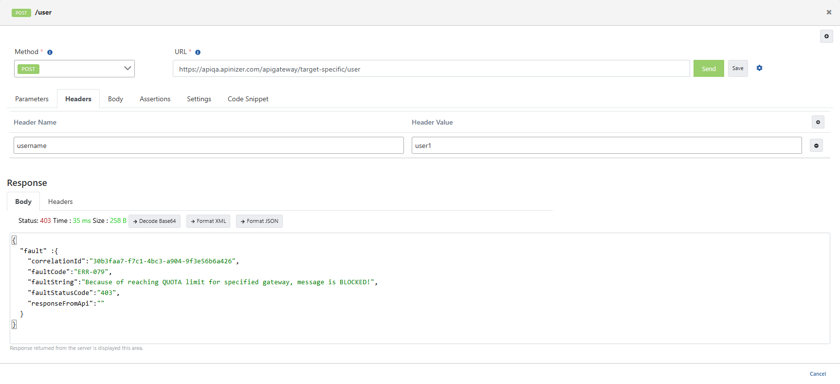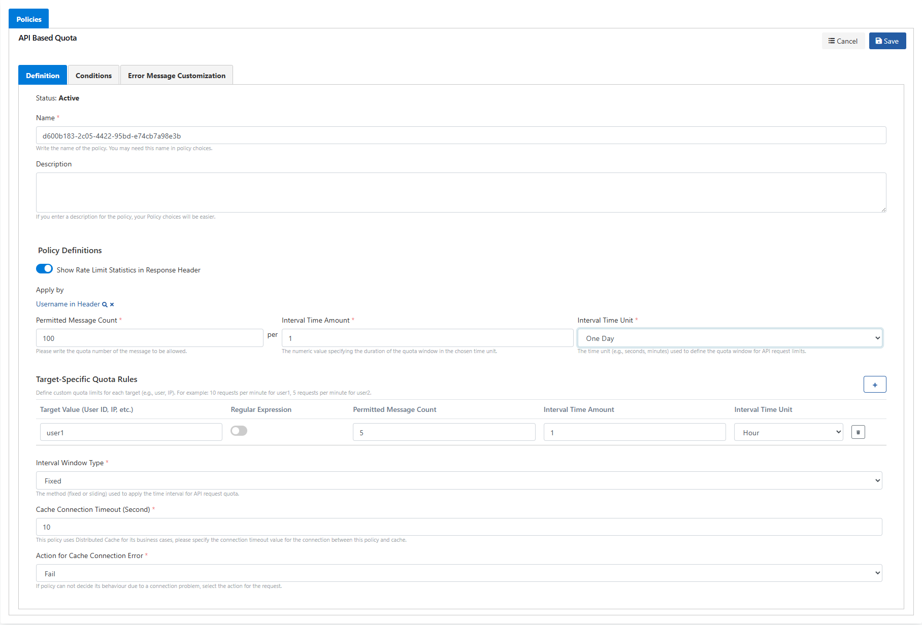 - Target-Specific Quota Rules (Hedefe Özel Kota Kuralları) kullanarak kullanıcı bazlı (header, body veya başka bir alana göre) özel kota sınırları belirlenebilmektedir. Genel politikada gelen istekleri Fixed Window (Sabit Pencere) yöntemiyle 1 gün için 100 istekle sınırlarken, aynı zamanda user1 kullanıcısı için saatte maksimum 5 istek limiti tanımlanabilmektedir.